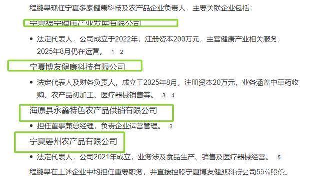 据悉,程鹏皋在宁夏成立了四家公司,并且担任其中的重要职位,由其创立的“杞利元”品牌在某音的销量也是非常高。