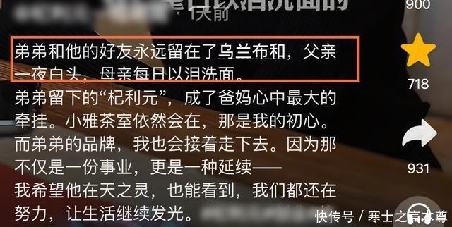 10月9号,有一位来自宁夏的网友突然分享了一段悼念弟弟的动态,并透露,弟弟去世之后,留下了好几家公司以及创立的品牌“杞利元”,为了让其事业得到延续,所以她和妹妹接受其事业,这也是老父亲的愿望。